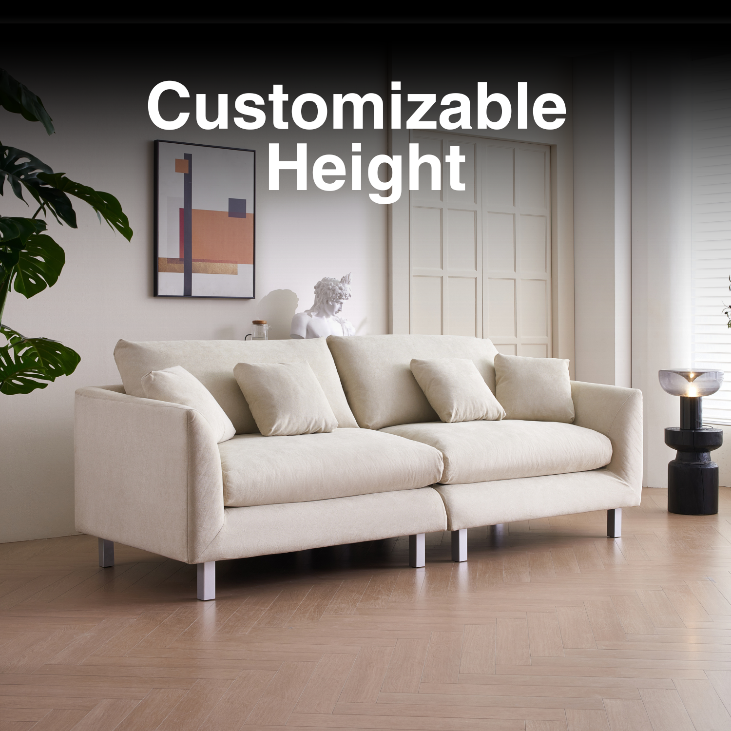 The feather sofa comes with two inch legs, which is designed for best comfort for most people. Though if you are taller than 6’1 or you just enjoy sitting higher up, you can easily change the legs to a 4 or 6 inch with the Feathers Sofa Legs.